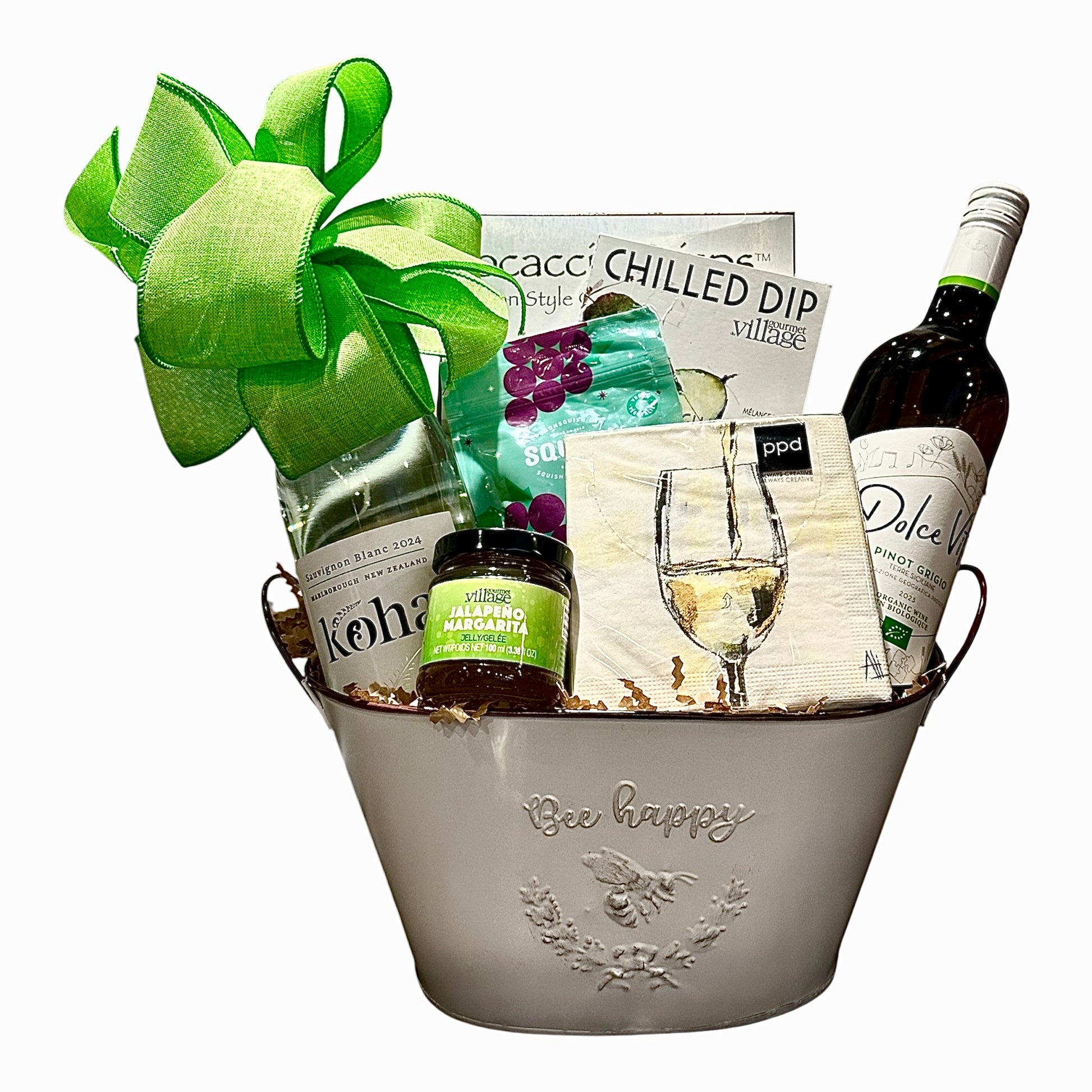 Includes 2 bottles of white wine and gourmet snacks in a decorative metal planter.