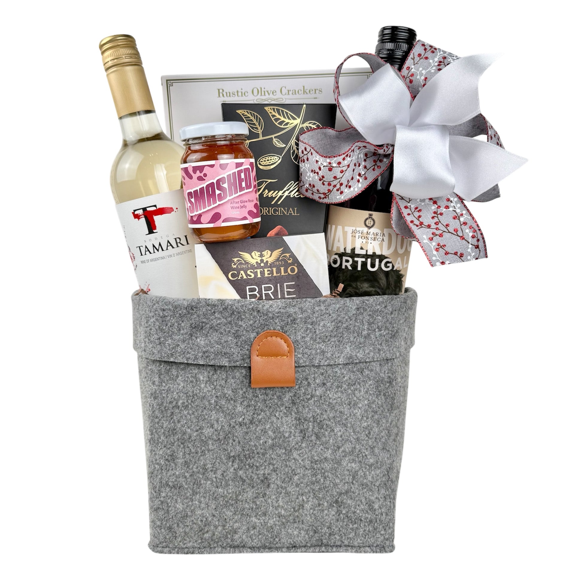 Includes 2 assorted bottles of white & red wine with gourmet snacks in a reusable storage basket.