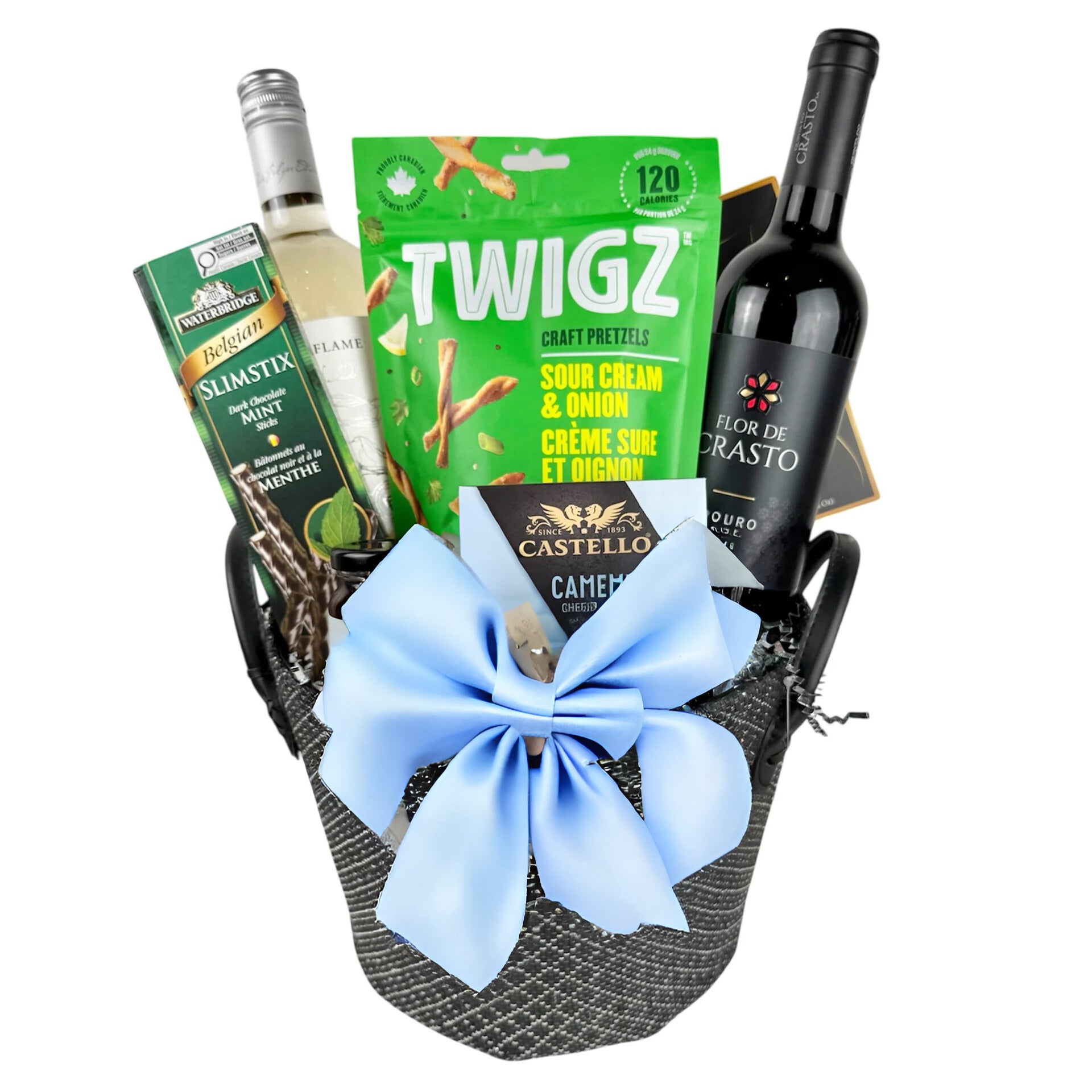 Includes 2 assorted bottles of white & red wine with gourmet treats in a decorative basket.